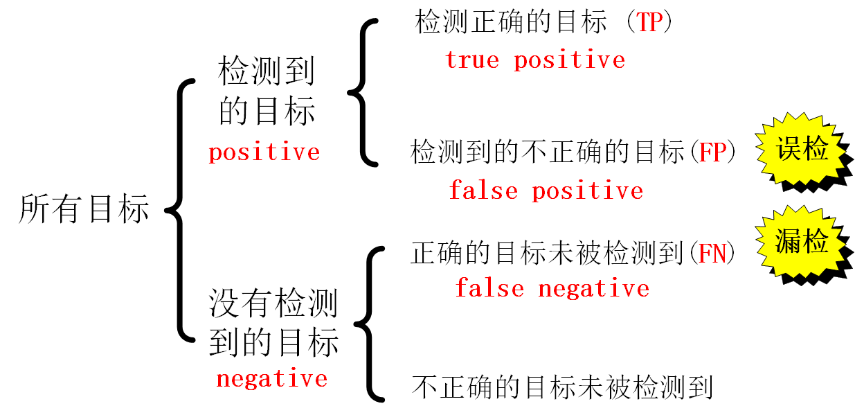 假设上面的例子里样本总共包含2300个目标,对样本中的目标进行检测,结果检测出来100个目标框,其中60个框检测到了目标,其余40个框没有检测到目标。