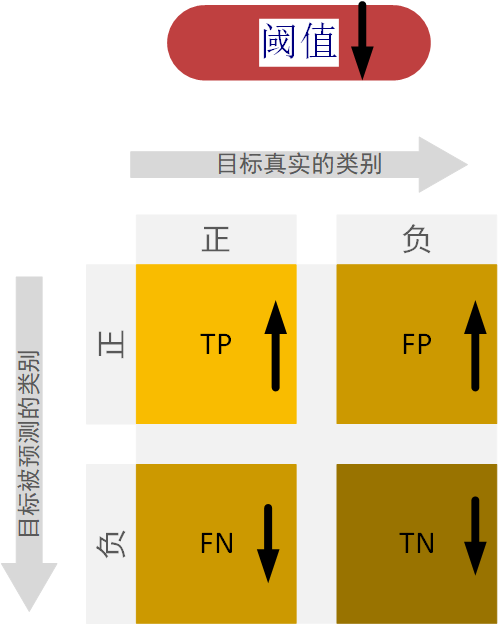 我们不妨推理一下,当阈值设的越低的时候,是不是有更多的样本会被分类为正样本,即更多的正样本被分类为正样本,更多的负样本被分类为正样本,那么TP与FP的数值应该是随着阈值的降低而增大的,那么相应的,因为正样本与负样本的各类的总数是没有变化的,所以正样本被认为是负样本的数量即FN是减少的,负样本被认为是负样本的数量即TN也是减少的。