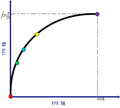 我以上图红点、绿点、蓝点、黄点以及紫点进行说明:黄点代表阈值为0.3的分类结果,蓝点代表阈值为0.5的分类结果,绿点代表阈值为0.7的分类结果。