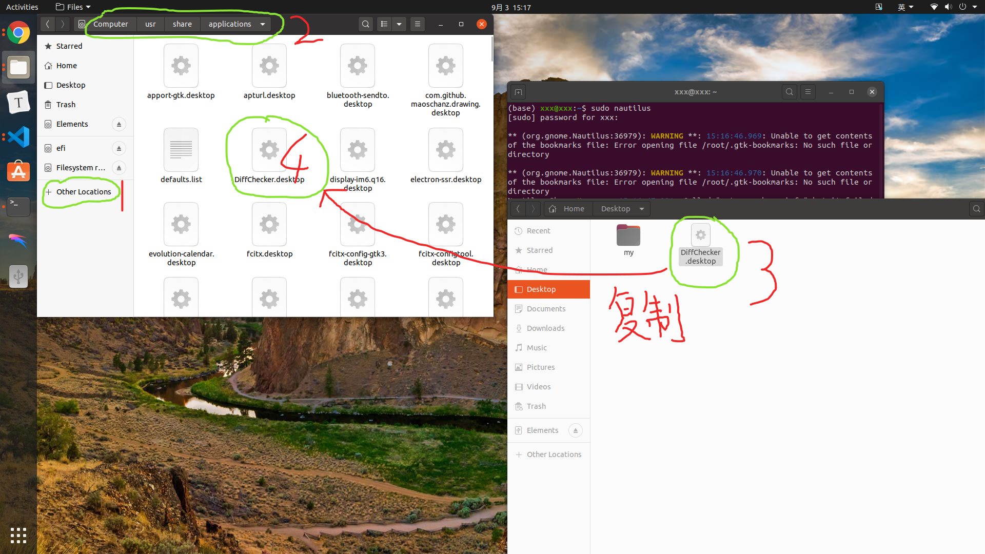 然后在弹出的文件窗口定位到/usr/share/applications,再将xx.desktop复制过来