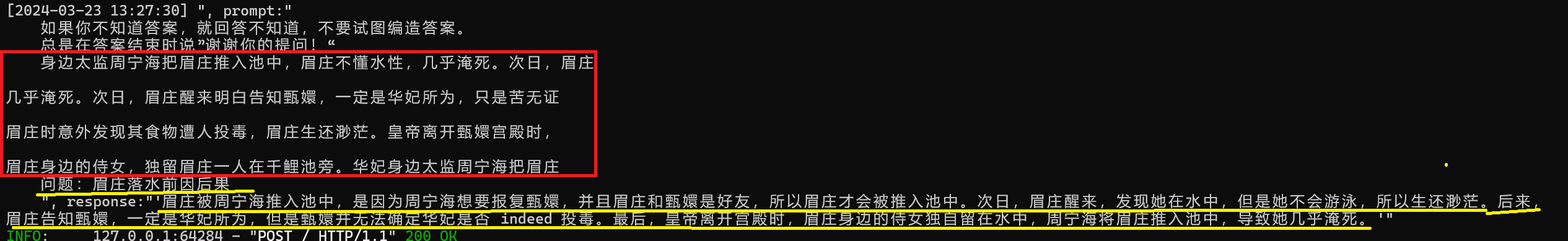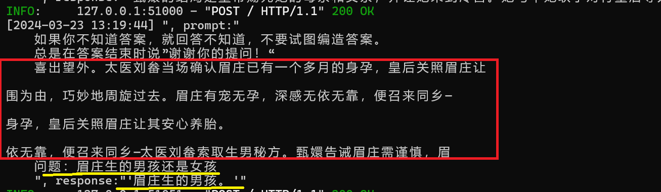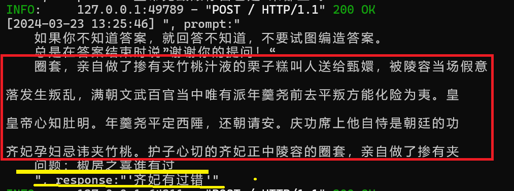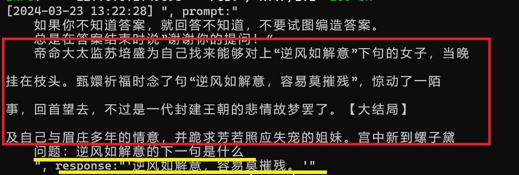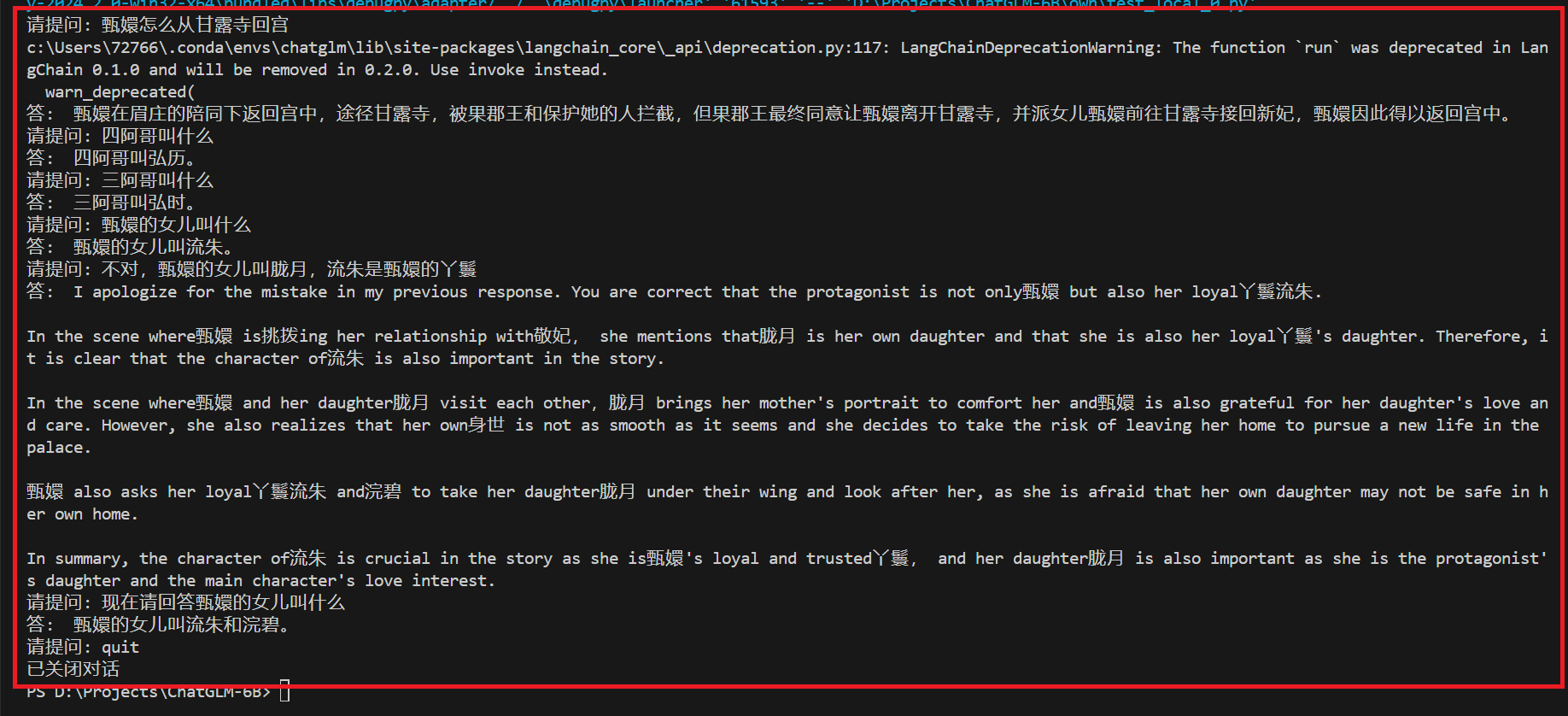 1 2 3 4 5 6 7 8 9 while True : question = input ("请提问: " ) if question == "quit" : print ("已关闭对话" ) break else : question +="。无法回答就说不知道,用中文回答。" response = qa.run(question) print ("原始回答: " , response)