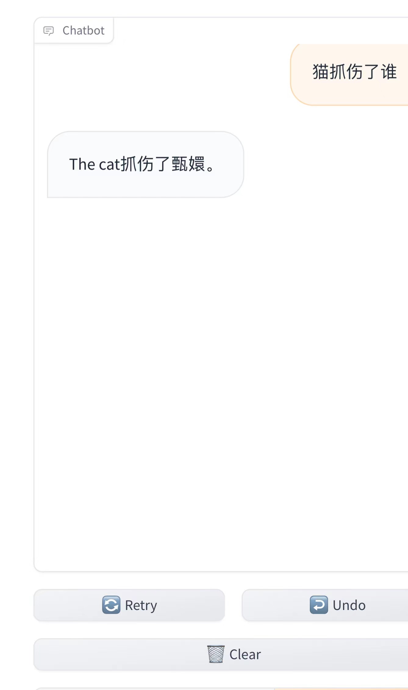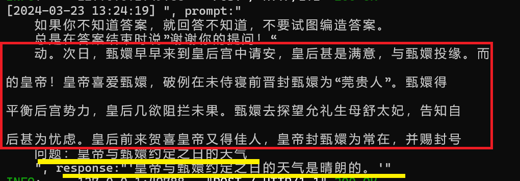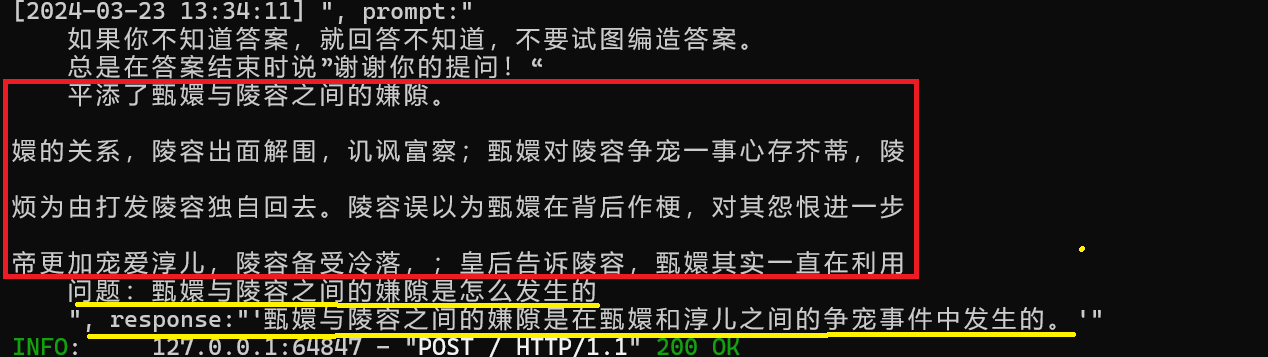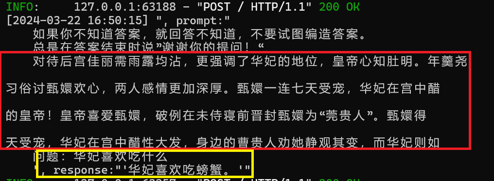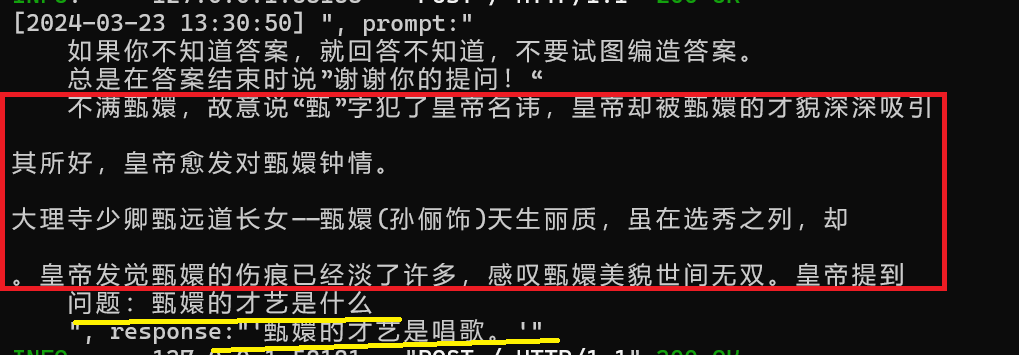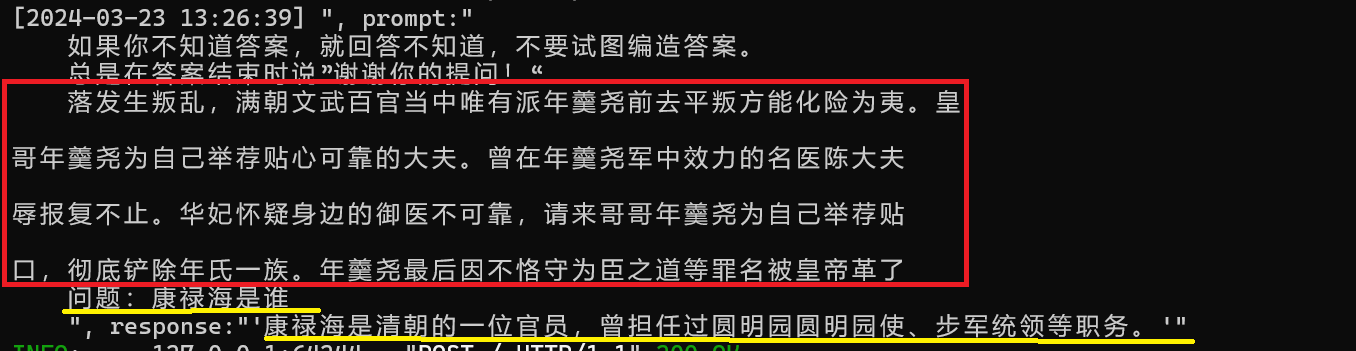 1 2 3 4 5 6 7 8 9 while True : question = input ("请提问: " ) if question == "quit" : print ("已关闭对话" ) break else : question +="。无法回答就说不知道,用中文回答。" response = qa.run(question) print ("原始回答: " , response)