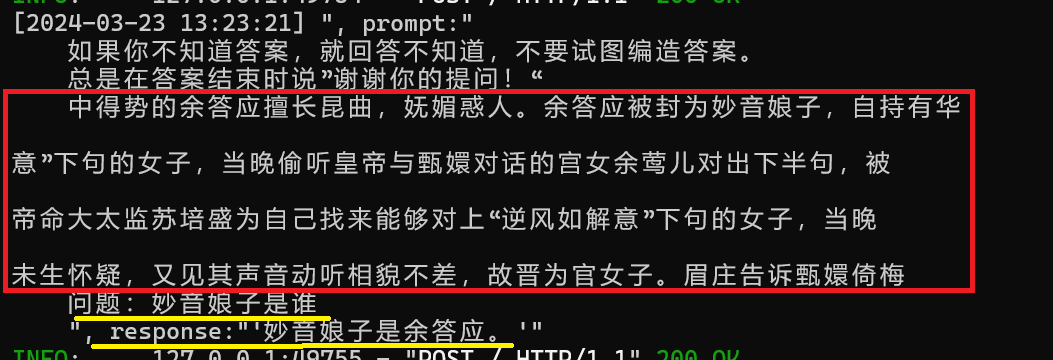 1 2 3 4 5 6 7 8 9 10 11 12 13 14 15 16 17 18 19 20 21 22 23 24 25 26 27 28 29 30 31 32 33 34 35 36 37 38 39 40 from langchain.vectorstores.chroma import Chromafrom langchain.embeddings.huggingface import HuggingFaceEmbeddingsfrom langchain.llms.chatglm import ChatGLM from langchain.chains import RetrievalQApersist_directory = 'vector_zhenhuanzhuan_32' model_name = "shibing624/text2vec-base-chinese" model_kwargs = {'device' : 'cuda:0' } encode_kwargs = {'normalize_embeddings' : False } embeddings = HuggingFaceEmbeddings( model_name=model_name, model_kwargs=model_kwargs, encode_kwargs=encode_kwargs ) db = Chroma(embedding_function=embeddings, persist_directory=persist_directory) llm = ChatGLM( endpoint_url='http://127.0.0.1:8000' , max_token=2000 , top_p=0.7 ) retriever = db.as_retriever() qa = RetrievalQA.from_chain_type( llm=llm, retriever = retriever, chain_type= "stuff" ) while True : question = input ("请提问: " ) if question == "quit" : print ("已关闭对话" ) break else : response = qa.run(question) print ("答: " , response)