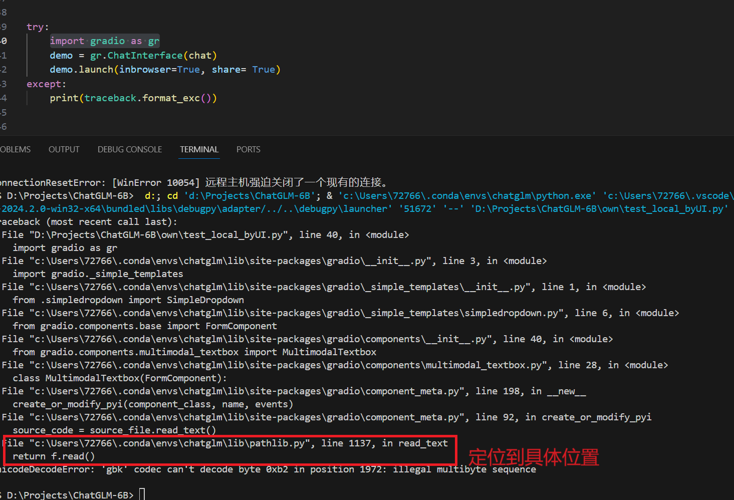 UnicodeDecodeError: ‘gbk’ codec can’t decode byte 0xb2 in position 1972: illegal multibyte sequence 开始问题出现在import gradio as gr,为了定位具体位置,加上traceback,最后找到是在read部分出现读入错误。
