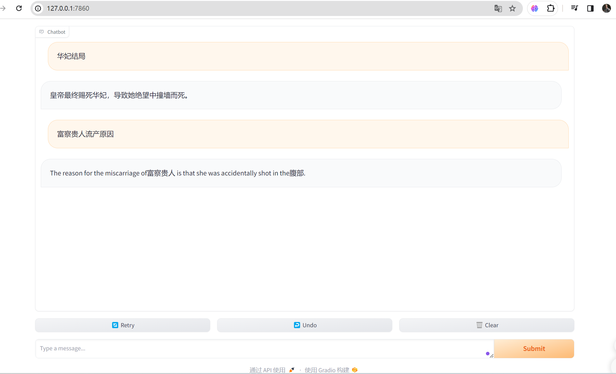 1 2 3 4 5 6 7 8 9 10 11 12 13 14 15 16 17 18 19 20 21 22 23 24 25 26 27 28 29 30 31 32 33 34 35 36 37 38 39 40 41 42 from langchain.vectorstores.chroma import Chromafrom langchain.embeddings.huggingface import HuggingFaceEmbeddingsfrom langchain.llms.chatglm import ChatGLM from langchain.chains import RetrievalQAimport tracebackpersist_directory = 'vector_zhenhuanzhuan_32' model_name = "shibing624/text2vec-base-chinese" model_kwargs = {'device' : 'cuda:0' } encode_kwargs = {'normalize_embeddings' : False } embeddings = HuggingFaceEmbeddings( model_name=model_name, model_kwargs=model_kwargs, encode_kwargs=encode_kwargs ) db = Chroma(embedding_function=embeddings, persist_directory=persist_directory) llm = ChatGLM( endpoint_url='http://127.0.0.1:8000' , max_token=2000 , top_p=0.7 ) retriever = db.as_retriever() qa = RetrievalQA.from_chain_type( llm=llm, retriever = retriever, chain_type= "stuff" ) def chat (question, history ): response = qa.run(question) return response try : import gradio as gr demo = gr.ChatInterface(chat) demo.launch(inbrowser=True , share= True ) except : print (traceback.format_exc())