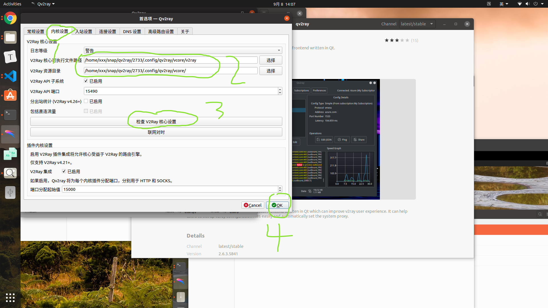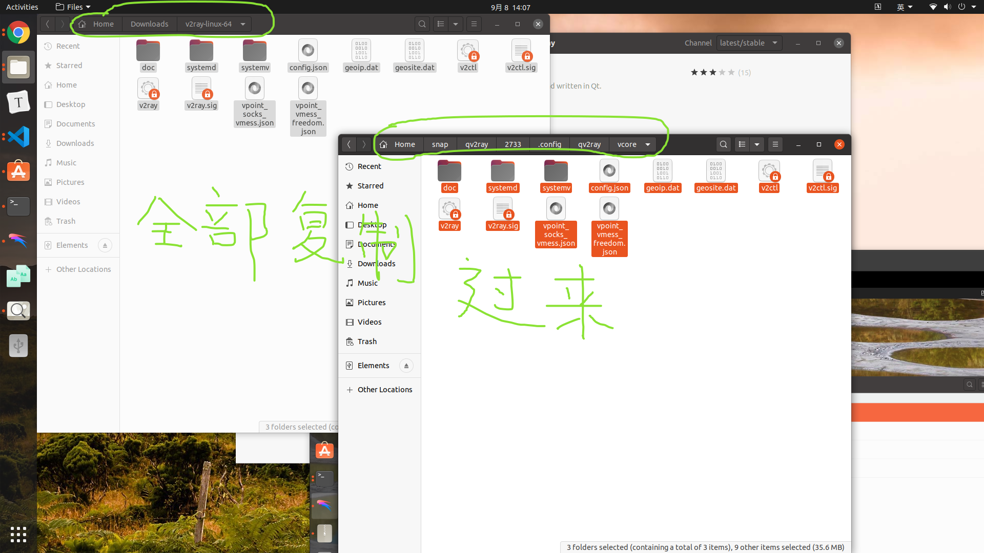 在/home/xxx/snap/qv2ray/2733/.config/qv2ray文件夹下新建vcore文件夹,并将之前下载的核心文件去全部拷贝到vcore文件夹内。注意这里的2733版本号是不固定的,根据你自己的来就好。另外就是你可能需要ctrl+h才能显示隐藏的.config文件夹,这里注意即可。
