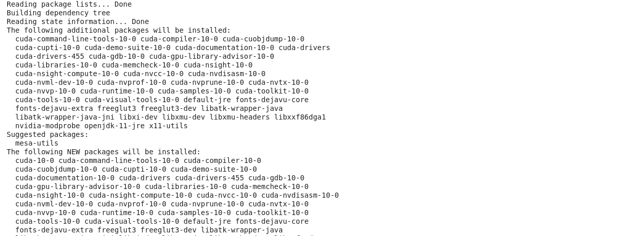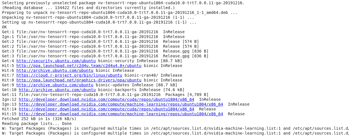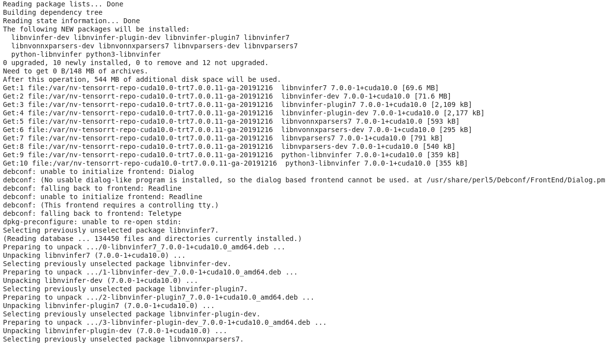 | 1 | !sudo apt-get install libnvinfer7=7.0.0-1+cuda10.0 libnvonnxparsers7=7.0.0-1+cuda10.0 libnvparsers7=7.0.0-1+cuda10.0 libnvinfer-plugin7=7.0.0-1+cuda10.0 libnvinfer-dev=7.0.0-1+cuda10.0 libnvonnxparsers-dev=7.0.0-1+cuda10.0 libnvparsers-dev=7.0.0-1+cuda10.0 libnvinfer-plugin-dev=7.0.0-1+cuda10.0 python-libnvinfer=7.0.0-1+cuda10.0 python3-libnvinfer=7.0.0-1+cuda10.0 |